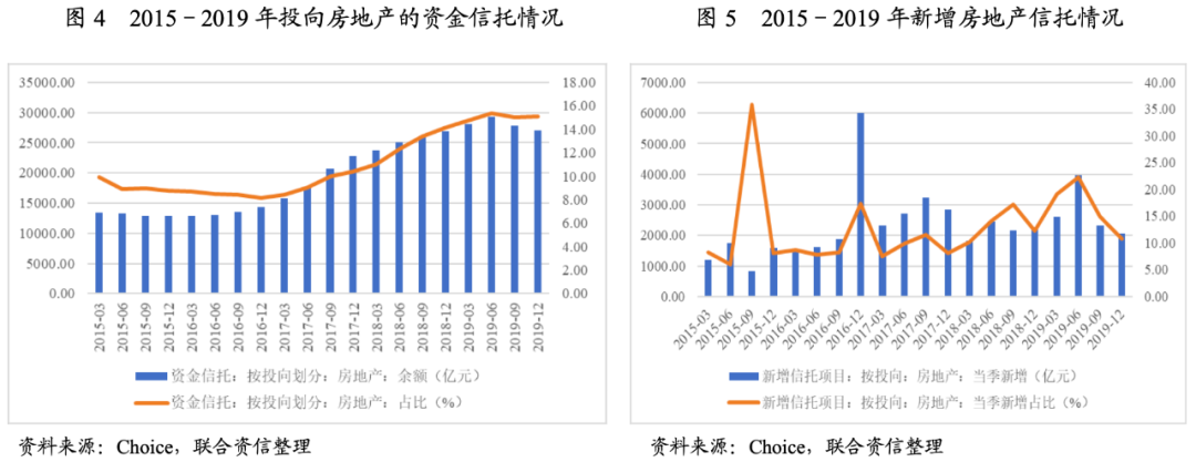 信托貸款方面,2019年7月銀保監(jiān)會先后約談了部分房地產(chǎn)信托業(yè)務(wù)增速過快、增量過大的信托公司,要求其控制業(yè)務(wù)增速,提高風險管控水平;同時要求信托公司的房地產(chǎn)信托業(yè)務(wù)需事前報告,監(jiān)管部門將進行逐筆審核;事前業(yè)務(wù)報告僅接受符合“四三二”條件且交易結(jié)構(gòu)為貸款模式,此外對于因合規(guī)原因被退回事前報告的房地產(chǎn)信托業(yè)務(wù),將嚴肅追究合規(guī)審查責任。受此影響,自2019年3季度起,房地產(chǎn)信托新增金額及占比、投向房地產(chǎn)領(lǐng)域的資金信托余額及占比均出現(xiàn)下滑,且該下滑態(tài)勢延續(xù)至今。