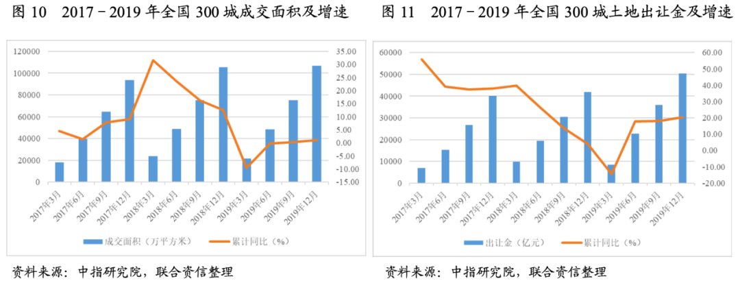 土地市場方面,2019年土地市場整體平穩(wěn),“穩(wěn)字當頭”的調(diào)控政策明顯。2019年,全國300個城市共推出土地面積12.98億平方米,同比增長1%;成交面積10.66億平方米,同比減少1%;出讓金總額50294億元,同比增長19%;土地溢價率13.1%,與上年基本持平。但2019年下半年以來受房地產(chǎn)調(diào)控政策收緊,金融監(jiān)管持續(xù)加強的影響,土地流拍率有所提高。