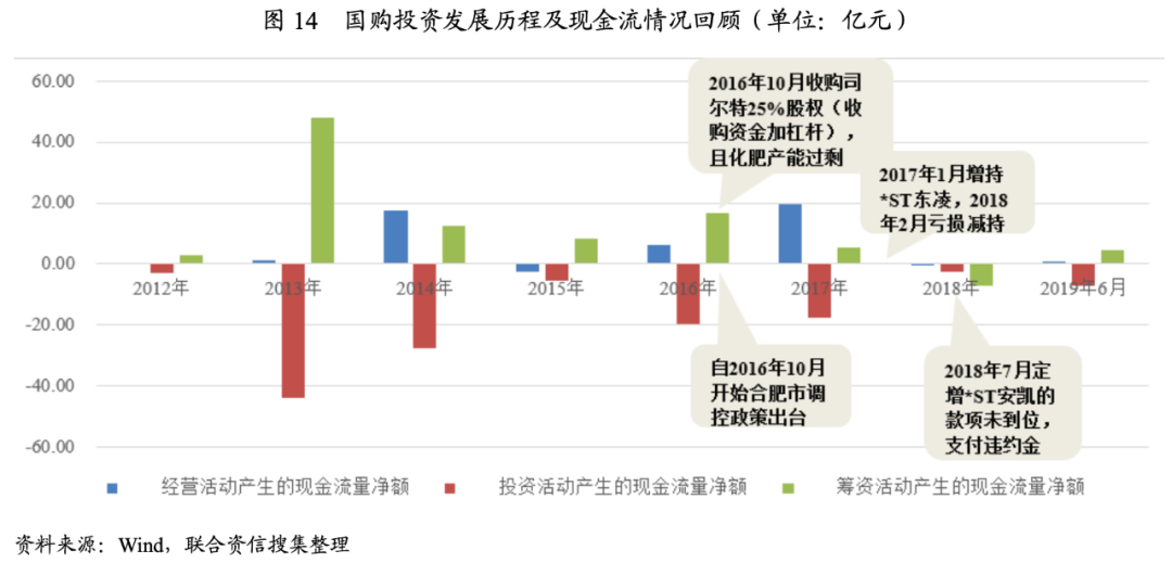 2016年10月21日,公司子公司國購產(chǎn)業(yè)控股有限公司與安徽省寧國市農(nóng)業(yè)生產(chǎn)資料有限公司簽署了《股份轉(zhuǎn)讓協(xié)議》,以15.80億元受讓司爾特1.80億股流通股股份,占司爾特已發(fā)行總股本的25%,成為該公司控股股東。司爾特業(yè)務(wù)以化肥生產(chǎn)為主,對公司跨界經(jīng)營和業(yè)務(wù)整合能力形成挑戰(zhàn),且與公司主業(yè)缺乏協(xié)同效應(yīng),在現(xiàn)金流本不就充裕且外部融資空間有限的情況下,多元擴張加速了公司資金消耗和風險積累。