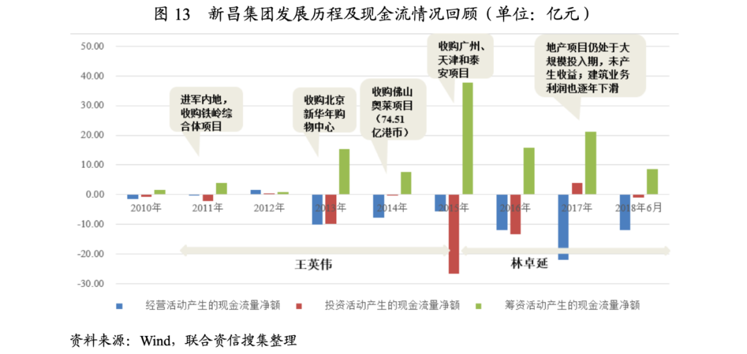 我們將新昌集團進軍內(nèi)地房地產(chǎn)市場的時間節(jié)點和現(xiàn)金流情況進行對比,回顧其發(fā)展歷程我們可以發(fā)現(xiàn):公司自2011年開始確立了以商業(yè)綜合體的模式進軍內(nèi)地房地產(chǎn)市場的策略,首個項目為收購獲取的鐵嶺項目,其后幾年內(nèi)斥資百億元以上收購了6個地產(chǎn)項目,但除北京項目外均屬于投資回報周期長且處于大規(guī)模投入未產(chǎn)生現(xiàn)金流的狀態(tài),高度依賴籌資活動;2016年以來核心的建筑業(yè)務(wù)利潤也逐年下滑,具體情況如下圖所示。