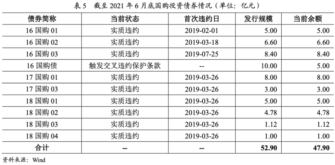 國購?fù)顿Y有限公司成立于2010年,是安徽省較大的區(qū)域性房地產(chǎn)開發(fā)企業(yè)之一,主營住宅地產(chǎn)、商業(yè)地產(chǎn)的開發(fā)與銷售,商業(yè)物業(yè)管理及運營,實際控制人為自然人袁啟宏。截至2021年6月底,公司共10只債券處于違約狀態(tài),具體情況如下表所示。