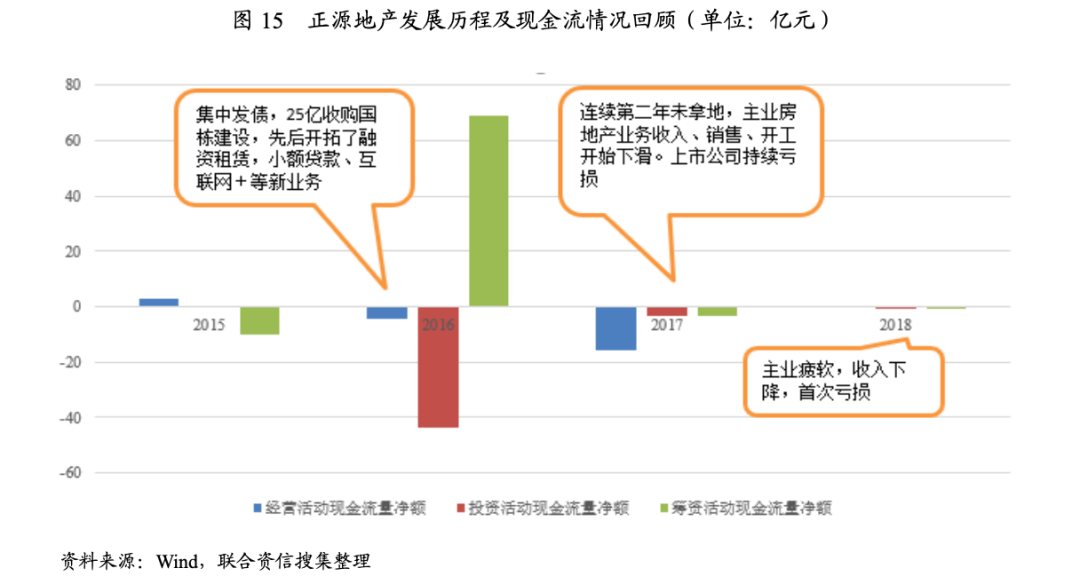 正源地產(chǎn)早期開發(fā)的“幸福e家”項目有一定的區(qū)域競爭力,口碑形象較佳,但2016年開始,正源地產(chǎn)盲目聚焦金融投資熱點,借助于寬松的融資環(huán)境,大舉發(fā)債,杠桿收購上市平臺,進軍建材、融資租賃,小額貸款、“互聯(lián)網(wǎng)+”等新興業(yè)務(wù)。2017年,公司房地產(chǎn)業(yè)務(wù)下滑,上市公司持續(xù)虧損,投資回報不及預(yù)期,籌資活動前現(xiàn)金流持續(xù)凈流出,造血能力逐步削弱,并走向債務(wù)危機。