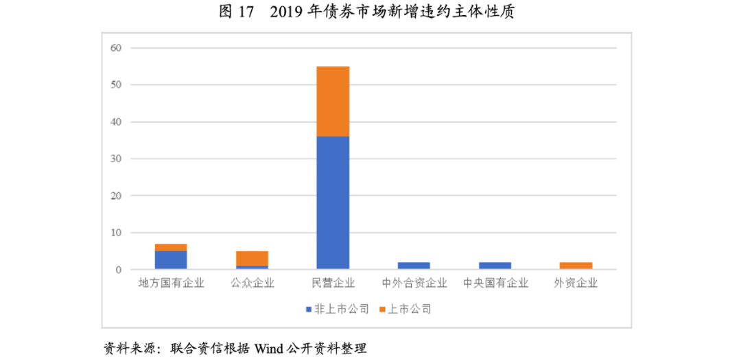從違約主體類型來看,2019年,民企依舊是主要違約主體,一方面,經(jīng)濟增速換擋,傳統(tǒng)業(yè)務(wù)為主的民企盈利能力趨弱,供給側(cè)改革使得民企聚集的中下游行業(yè)盈利再度受擠壓;另一方面,信用收縮周期,疊加包商銀行事件,中小銀行信用供給進一步下降,對民營企業(yè)融資造成不利影響,主業(yè)不強、融資激進、業(yè)務(wù)過于多元的企業(yè)信用風險逐步暴露。此外,地方國有企業(yè)違約數(shù)量開始增加,主要分布在青海、遼寧、內(nèi)蒙古等經(jīng)濟實力較弱,可調(diào)配金融資源有限的區(qū)域。
