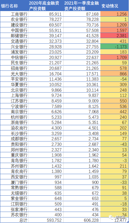 首先來看看商業(yè)銀行這個(gè)債券市場(chǎng)最大的買方,商業(yè)銀行自營的投債資金主要來源于兩個(gè)方面,一個(gè)是增量資金。每年商業(yè)銀行的資負(fù)部門會(huì)在年初結(jié)合各方面因素,確定增量資金在債券、公司貸款、個(gè)人貸款和票據(jù)之間的擺布,從A股38家上市銀行公布的數(shù)據(jù)來看,其金融投資投資科目(主要是債券投資)之和,從年初的59.37萬億元,上升到3月底的60.62萬億元,仍然保持了一個(gè)穩(wěn)定的增長。