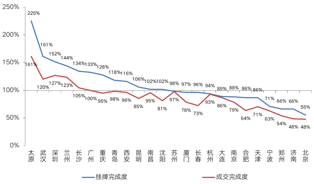 各個城市供地完成情況基本一致,基本呈現中西部城市“超標”、而樓市下行城市供地不足的分化格局。