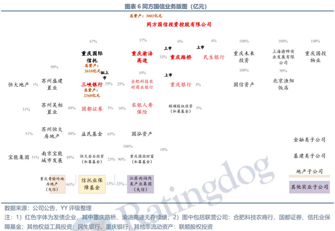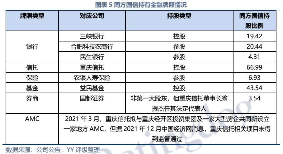 同方國信曾被人稱為重慶金融的“半壁江山”,其以重慶信托為支點,控股和參股多家金融機構,以三峽銀行為核心,一手把握信托、銀行、保險(參股)、基金、券商(參股)等牌照。