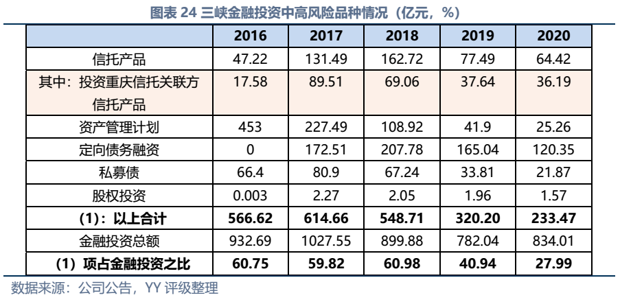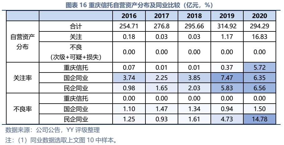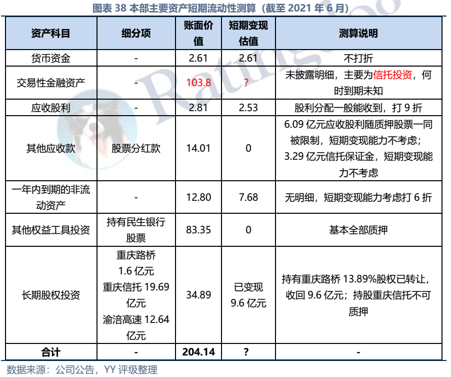 因同方國信子公司獨立性較強,我們主要梳理了本部的資產以及測算了債務壓力和短償債能力。資產方面,以信托投資(交易性金融資產103億元主要為信托投資)、民生銀行股票(最新市值約73億元,已質押,2019年來市值縮水37%)、重慶信托67%股權(賬面以成本法計量僅20億元,但按重慶信托最新凈資產計量則價值282億元)為主;債務方面,19年以來,本部有息債務水平有所降低(主要通過可供出售金融資產變現償還),截至21年中,有息債務205億元,短債107億元,22年將有64億元債券到期或行權,短債壓力較大。測算短期可變現資源,預計短期內變現能力比較確定的僅約22億元,要覆蓋22年內到期或行權的64億元債券還有較大缺口,可能需要關注信托投資資產或者牌照的價值(比較難及,且由于重慶信托股權不可質押,且前文所描述,重慶信托的真實控制權在新渝富的持股鏈條上,同方國信更多是居于財務投資這一角色,可能如果臨時出現兌付危機,假設重慶信托的資產質量仍有支持,股權仍有較高價值)。