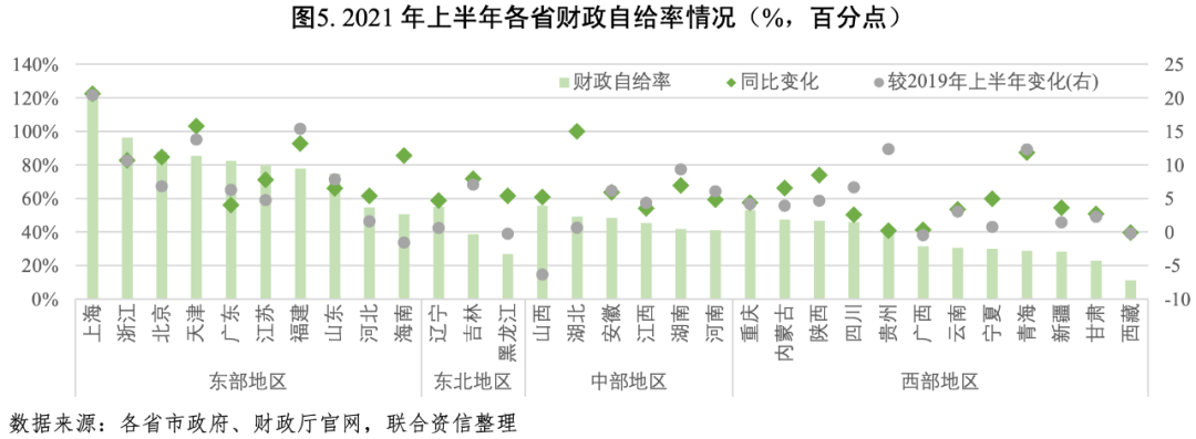 2021年上半年,多數省份均收不抵支,僅上海實現財政盈余,浙江和天津基本實現收支平衡。中部、西部地區收支缺口較大,東部地區收支缺口較小。河南、四川收支缺口最大,超過3000億元。收支缺口小于1000億的省份中,福建、北京、天津、浙江等東部省份財政收支平衡壓力相對較小,而西藏、青海和寧夏主要是由于財政體量較小所致,財政自給率更適合進行各省財政收支平衡情況的橫向比較。