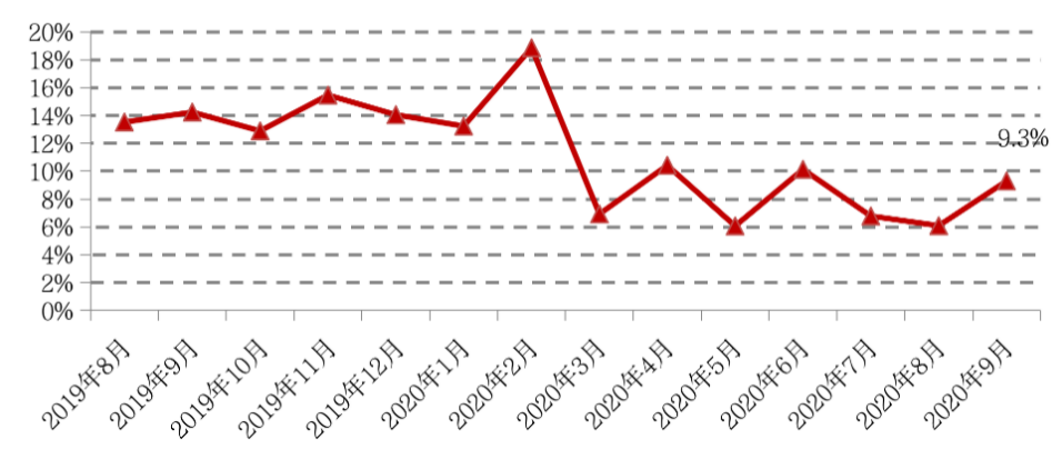 進(jìn)入三季度,受熱點(diǎn)城市調(diào)控政策收緊、供地結(jié)構(gòu)改變、“三條紅線”融資新政的多重影響,土地市場(chǎng)熱度明顯下降,9月CRIC重點(diǎn)監(jiān)測(cè)的城市土地流拍率升至9.3%,較上月增加3.2個(gè)百分點(diǎn),無人競(jìng)拍或未達(dá)底價(jià)而流拍的地塊占到五成。