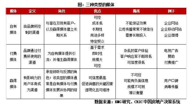從數(shù)字到達(dá)的渠道分類,將媒體分為三類,即自有媒體(Owened media)、付費(fèi)媒體(Paid media)和贏得媒體(Earned media),每種媒體都有不同的好處、應(yīng)用方法和挑戰(zhàn)。自有媒體是指品牌自有的媒體,對(duì)房企而言,主要是自建小程序、微博、官方網(wǎng)站、APP等;付費(fèi)媒體主要是推廣平臺(tái),為企業(yè)付費(fèi)使用的渠道,房企在數(shù)字時(shí)代營(yíng)銷付費(fèi)媒體主要有房產(chǎn)中介門戶網(wǎng)站、電視廣告、付費(fèi)媒體廣告;贏得媒體是一個(gè)公關(guān)用來(lái)宣傳的媒體,即有影響力的用戶本身成為渠道。如用戶口碑、社交網(wǎng)絡(luò)傳播等方式。企業(yè)需要充分研究不同渠道潛在客戶轉(zhuǎn)化率,選擇更加高效的方式來(lái)促進(jìn)交易。