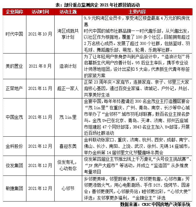 目前房企的社群活動(dòng)主要可以分為三類,第一類是簡(jiǎn)單的聚集活動(dòng),可以是由企業(yè)組織的,如金茂U+已在北京、青島、天津、濟(jì)南、鄭州五座城市組建起47個(gè)同好部落,3843名業(yè)主加入U(xiǎn)+部落,開(kāi)展近百場(chǎng)社群活動(dòng)。金科鄰里文化節(jié)暨趣味冬奧會(huì),綠城“綠粉圈子”功能等都屬于這一類。第二類是由企業(yè)組織一些業(yè)主關(guān)懷和回報(bào)活動(dòng),如金茂每年都會(huì)在年終的時(shí)候舉辦“金宴中國(guó)”活動(dòng),邀請(qǐng)近300名業(yè)主共聚一堂打造圈層社交,提升客戶體驗(yàn)??“l(fā)第四屆業(yè)主節(jié)于今年12月15日正式啟幕,為了提高業(yè)主參與度,今年以“俊發(fā)有禮 心動(dòng)有你”為主題,不僅規(guī)劃了線上萬(wàn)人挑戰(zhàn)時(shí)尚樂(lè)玩、海量房源一站式選購(gòu)等活動(dòng),還成立了由業(yè)主和媒體代表組成的“監(jiān)造官”,親自走進(jìn)項(xiàng)目,從工程質(zhì)量、品質(zhì)細(xì)節(jié)、工藝標(biāo)準(zhǔn)等維度考量項(xiàng)目,以體現(xiàn)俊發(fā)的“三心”服務(wù)。