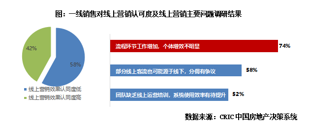2020年疫情以來(lái),線上營(yíng)銷逐步成長(zhǎng)為企業(yè)的常規(guī)手段之一,根據(jù)CRIC的調(diào)研,2021年頭部房企線上客流的占比從2020年的18%再度上升至了2021年的23%,繼續(xù)保持增長(zhǎng)勢(shì)頭。但現(xiàn)階段我們也發(fā)現(xiàn)一線售樓團(tuán)隊(duì)對(duì)于線上營(yíng)銷認(rèn)識(shí)仍然不足,平均認(rèn)同度僅有42%,并且74%的一線銷售員反饋線上營(yíng)銷導(dǎo)致流程環(huán)節(jié)工作增加,個(gè)體增效不明顯,58%認(rèn)為部分線上客流也可能源于線下,分傭有爭(zhēng)議,52%的認(rèn)為團(tuán)隊(duì)缺乏線上運(yùn)營(yíng)培訓(xùn),系統(tǒng)使用效率有待提升。因此不論是技術(shù)層面還是從業(yè)人員教育層面,線上營(yíng)銷的發(fā)展仍需要時(shí)間。
