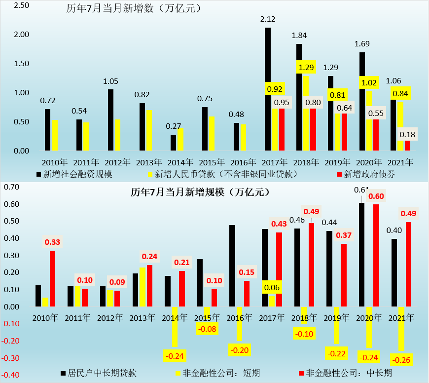 2021年7月,新增社會融資規模達到1.06萬億,同比和環比分別大幅少增0.63萬億和2.61萬億。其中,新增人民幣貸款、新增未貼現票據和新增政府債券同比分別少增0.18萬億、0.12萬億和0.36萬億,三者合計共拖累社融少增0.66萬億,可以看出政府債券拖累最為明顯,主因應是政府發行節奏放緩。