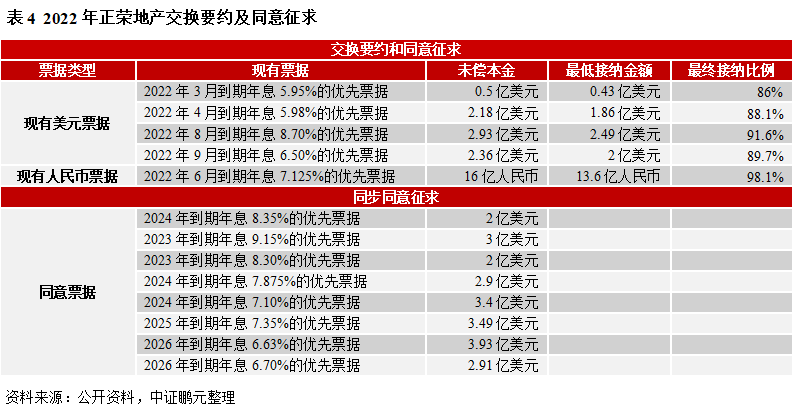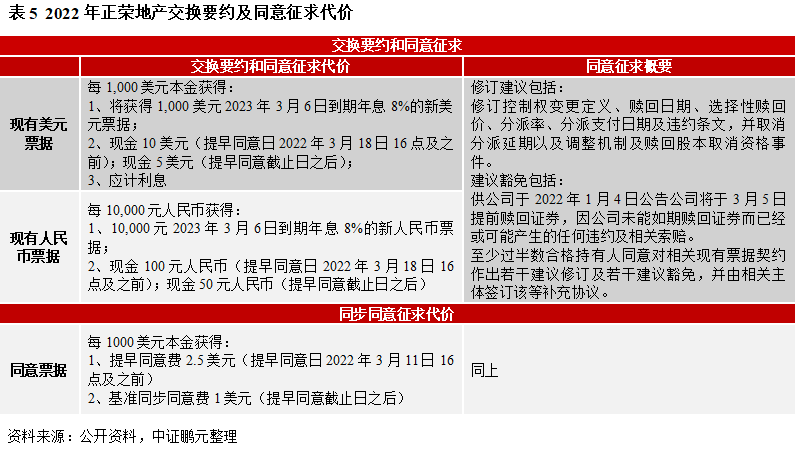 2022年房地產市場仍然面臨很大壓力,市場未出現(xiàn)大幅回升及多重融資選擇依然偏緊的情況下,正榮地產集團有限公司(簡稱“正榮地產”,6158HK)對其短期流動性仍持謹慎態(tài)度。公司預計其現(xiàn)有內部資源可能不足以償還2022年3月到期境外債務,(1)于2022年2月21日對存續(xù)多只境外債券發(fā)起交換要約和同意征求,包括4只美元票據(jù)、1只人民幣票據(jù)(分別簡稱“現(xiàn)有美元票據(jù)”、“現(xiàn)有人民幣票據(jù)”,合并簡稱“現(xiàn)有票據(jù)”)。后經多次修改,交換要約和同意征求期限變更為2022年3月4日-3月18日17點(倫敦時間,下同),提早同意截止日由3月4日延期至3月18日16點。(2)2022年2月21日-3月11日17點對8只美元票據(jù)(簡稱“同意票據(jù)”)進行同步同意征求,其中,提早同意日后續(xù)由3月4日延期至3月11日16點。根據(jù)公告,2022年3月28日召開持有人會議,審議上述特別議案,即同意征求涉及的修訂及豁免事項。3月29日,待特別決議通過,完成補充文件簽署,支付相關同意費用后,方可執(zhí)行相關修訂條款。