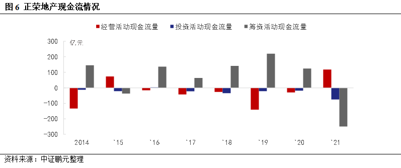 借助債務融資,正榮地產2016年來迅速擴張,2018年赴港上市成功,同年步入銷售額千億房企。2019年,惠譽將公司級別由B上調至B+,穆迪由B2上調至B1,2021年6月惠譽繼續(xù)上調展望至正面。正榮地產的債券融資以境外市場為主,境內市場以資產支持證券為主要品種,發(fā)行日集中在2020年,到期日集中在2021年和2023年。高度依賴外部融資的“高杠桿、高周轉”模式,在2021年下半年被迫結束。2021年,正榮地產籌資活動現(xiàn)金流由正大幅轉負,境內債券融資腰斬,境外債券融資抓住上半年窗口期,此后融資也開始減少。隨著債務陸續(xù)到期,2021-2023年償還壓力大幅攀升,外部融資高度敏感,2021年公司加大回購債券力度,分多次累計回購約0.65億美元債券,提振市場信心。2022年伊始,三大評級機構相繼下調公司發(fā)行人級別。