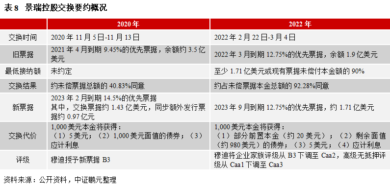 根據(jù)2月21日以來交換要約和同意征求公告,有效交回現(xiàn)有票據(jù)的合格持有人,視為對同意征求的同意,持有人不能僅同意征求而不同意交換要約,即同意交換要約就表示接受同意征求。交換要約最低接納金額為各系列票據(jù)未償本金的85%。同意征求需各系列票據(jù)過半數(shù)持有人同意,涉及的條款修訂及豁免將對現(xiàn)有票據(jù)及未來所有持有人生效。根據(jù)公告,交換代價為“等值新票據(jù)+應計利息+現(xiàn)金”。新票據(jù)為2023年3月6日到期,年息8%的優(yōu)先票據(jù),同時,公司將在到期日按本金的102%償還全部新票據(jù)本金和應計利息。