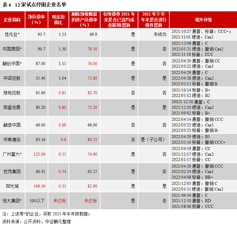 從目前企業(yè)所處困境和政策支持來看,12家重點紓困企業(yè)是進行債券置換和同意征求的合適對象。一方面,是企業(yè)有金融機構的資金支持,可以較快緩解短期流動性壓力,另一方面,上述企業(yè)2021年合約銷售額均在1,000億元以上,集中在全國前三十,業(yè)務以長三角為主,土儲質量較高,未來項目去化環(huán)境較好。一定程度的外部支持,可以極大推動企業(yè)債務風險化解,降低交換風險。截至2022年5月14日,12家房企中6家未公布2021年年報,其中,融信中國和廣州富力因更換會計師而延期披露。根據(jù)各家公司最新數(shù)據(jù)(上述6家采用2021年半年報),其中陽光城和廣州富力為紅擋。目前,除綠地控股、融信中國和中南建設外,其余企業(yè)在2021年來均出現(xiàn)了美元債違約、展期或置換。具體來看,除凈負債率外,另外兩個指標多未達標,尤其是現(xiàn)金短債比。短債上升、現(xiàn)金減少,使得該指標惡化。即使現(xiàn)金短債比達標,但集團內部或存在資金使用不規(guī)范的問題,限制比例升高,都會造成償債資金缺口。