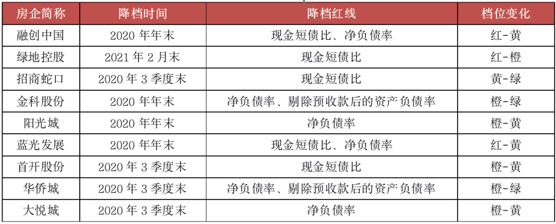 據(jù)統(tǒng)計,目前已有多家房企成功降檔,截止至2020年三季度,招商蛇口、首開股份、華僑城、大悅城等房企成功降檔;截止至2020年年底,融創(chuàng)、金科、陽光城、藍光等房企成功降檔;2021年2月末,綠地稱提前“轉(zhuǎn)綠”達標。