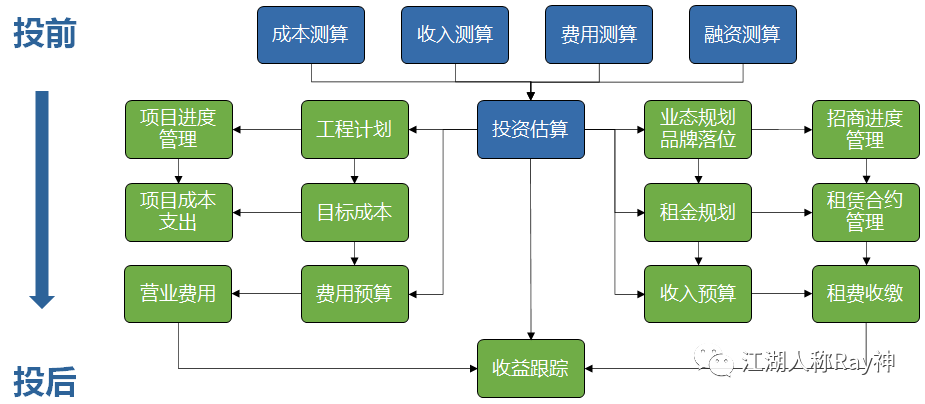 要知道,凡事都有其既定的邏輯。不動產實現要其投資收益,從根本上說就是對現金流的管理。一個項目整個生命周期的現金流,包括獲得資產的付出(如:土地成本、建設成本等)、持有資產的收益與支出(租金、運營費用等)、退出資產的所得(如:凈銷售收益),此外還有投資及運營涉及的資本金(融資金額、本金償還、利息費用等)。只有這些現金流的凈額,能夠符合投資收益所要求的狀態,才能確保項目最終能實現業主方所要求的回報。