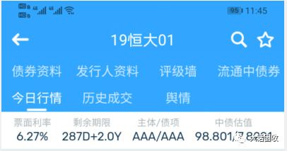 下面是恒大的19恒大01(155406),債券評級AAA,主體評級AAA,票面利息年化6.27%。