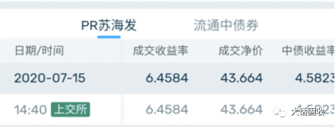 城投的也有,但除了貴州的,收益都不算高。例如PR蘇海發(124232),發行人江蘇海州灣發展集團有限公司(由于已經償還了部分本金,成交凈價不以100為基準);連云港區級城投,主體評級AA,債券評級AA+。以最近的成交價買入,年化收益能到6.45%;剩余期限是2.68年。