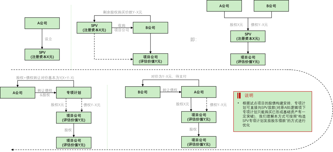 4. 在沒有合適存量負債的情況項下,專項計劃受讓SPV100%股權,然后向SPV發放股東貸款,SPV以其獲得的股權投資與債權投資,共同出資受讓項目公司100%股權,然后進行反向吸收合并。