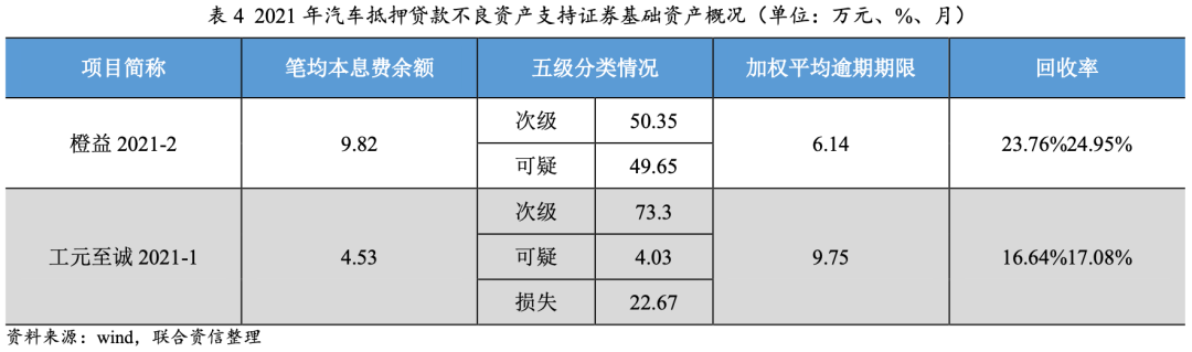 2021年,共發行2單汽車抵押貸款不良資產支持證券,證券發行規模8.74億元,僅占總發行規模的2.91%,基礎資產未償本息費余額61.19億元。從五級分類情況來看,次級類未償本息加權平均余額占比高,為70.13%。入池不良資產貸款單筆平均本息費余額小于10萬元,單筆平均本息費余額較小,分散度較高,同質性較高。入池資產加權平均逾期期限為9.25個月,入池資產逾期期限短。從擔保方式來看,抵押物均為車輛。基礎資產附帶的抵押物的表現能力一般,但由于基礎資產分散度高、同質性高及逾期期限短等特點,汽車類NPL產品加權平均回收率在18%左右,稍高于信用卡類不良產品。