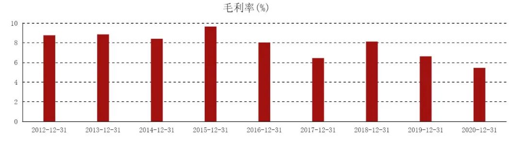 但利潤率卻不盡人意:凈利率僅3.92%;毛利率為12.5%,同比下滑8.77個百分點(diǎn),相對于同等規(guī)模的企業(yè)而言已居于末位水平。