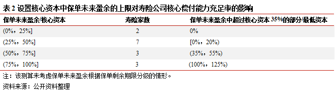 (ii) 計(jì)入核心資本的保單未來(lái)盈余不得超過(guò)核心資本的35%,且根據(jù)保單剩余期限的不同,保單未來(lái)盈余將分別計(jì)入核心資本、附屬資本,該調(diào)整會(huì)在不同程度上降低壽險(xiǎn)公司的核心償付能力充足率,大型壽險(xiǎn)公司保單的未來(lái)盈余規(guī)模及其占核心資本的比重均較高,受相關(guān)政策影響較為明顯。