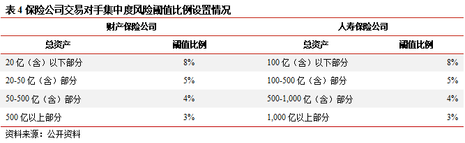 (3) 增加集中度風(fēng)險(xiǎn)最低資本要求,防止風(fēng)險(xiǎn)敞口過(guò)于集中。償二代二期工程增加了集中度風(fēng)險(xiǎn)最低資本要求:一是交易對(duì)手集中度風(fēng)險(xiǎn),按保險(xiǎn)公司持有同一交易對(duì)手的各類(lèi)資產(chǎn)賬面價(jià)值總和超過(guò)總資產(chǎn)的閾值比例計(jì)算,閾值比例見(jiàn)下表,設(shè)置特征因子為0.4;二是大類(lèi)資產(chǎn)集中度風(fēng)險(xiǎn),保險(xiǎn)公司持有權(quán)益類(lèi)資產(chǎn)、其他金融資產(chǎn)、境外投資超過(guò)規(guī)定比例限制的,設(shè)置特征因子為0.2;三是房地產(chǎn)集中度風(fēng)險(xiǎn),保險(xiǎn)公司直接持有的投資性房地產(chǎn)和通過(guò)非基礎(chǔ)資產(chǎn)間接持有的房地產(chǎn)的賬面價(jià)值占保險(xiǎn)公司總資產(chǎn)的比例超過(guò)25%時(shí),應(yīng)當(dāng)對(duì)所有計(jì)量房地產(chǎn)價(jià)格風(fēng)險(xiǎn)的資產(chǎn),設(shè)置特征因子為0.5。