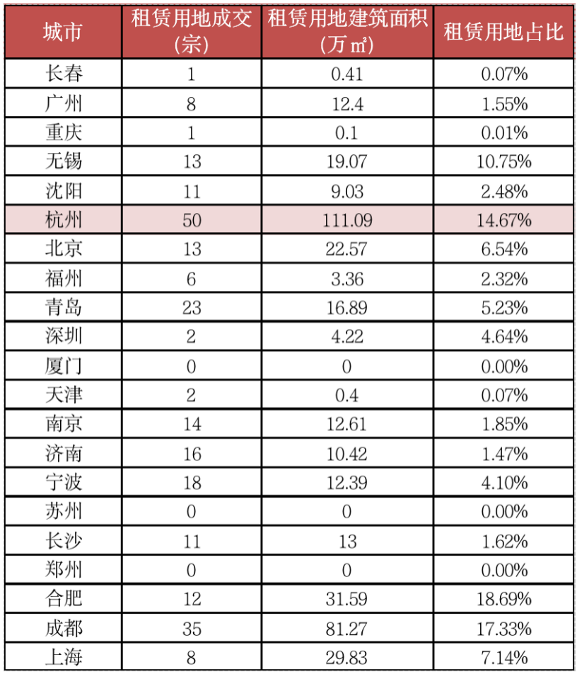從首批租賃用地成交情況來看,杭州競自持用地高達41宗,占比超七成,其中已成交涉租賃用地成交宗數達50宗,占成交地塊88%;成交建面111.09萬平方米,高居22城榜首,租賃用地占比已達14.67%。成都已成交涉租賃用地也達到了35宗,租賃用地面積達到81.27萬平方米,占比達17.33%;合肥這一比例更高,租賃用地面積占已成交地塊面積達到18.69%。此外,廈門成交土地共5宗,所有地塊均需部分自持。