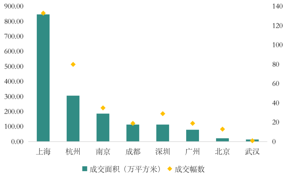 從數據可以看出,上海租賃用地無論是累計成交面積還是成交幅數都排全國首位,并遙遙領先于第二、第三位的杭州和南京。