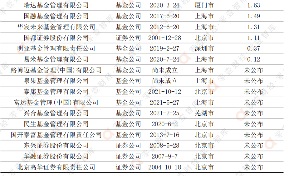 與此同時,有10家管理人的管理規模在10億元以下,其中有8家的管理規模高于1億元,而明亞基金和易米基金的管理規模則是低于5000萬元的“清盤線”(多數公募基金的合同生效后,如在規定時間內基金份額持有人數量不滿200人或資產凈值低于5000萬元,將觸發清盤)。