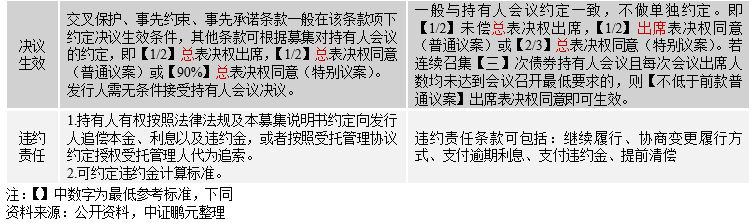 根據銀行間市場對持有人會議的規定,出席持有人會議的持有人所持表決權應超過總表決權50%,且普通議案需總表決權50%(此為最低標準)的持有人同意/特別議案(包括變更與償付有關的發行條款、新增或變更選擇權、投資人保護機制或保護條款等)需總表決權90%(此為最低標準)的持有人同意。而對于設定保護性條款的債券,其相關豁免議案需滿足特別規定。例如,交叉保護、事先約束和實現承諾條款項下,豁免違約議案需同時滿足總表決權的2/3以上出席和出席會議持有人所持表決權的3/4以上同意。