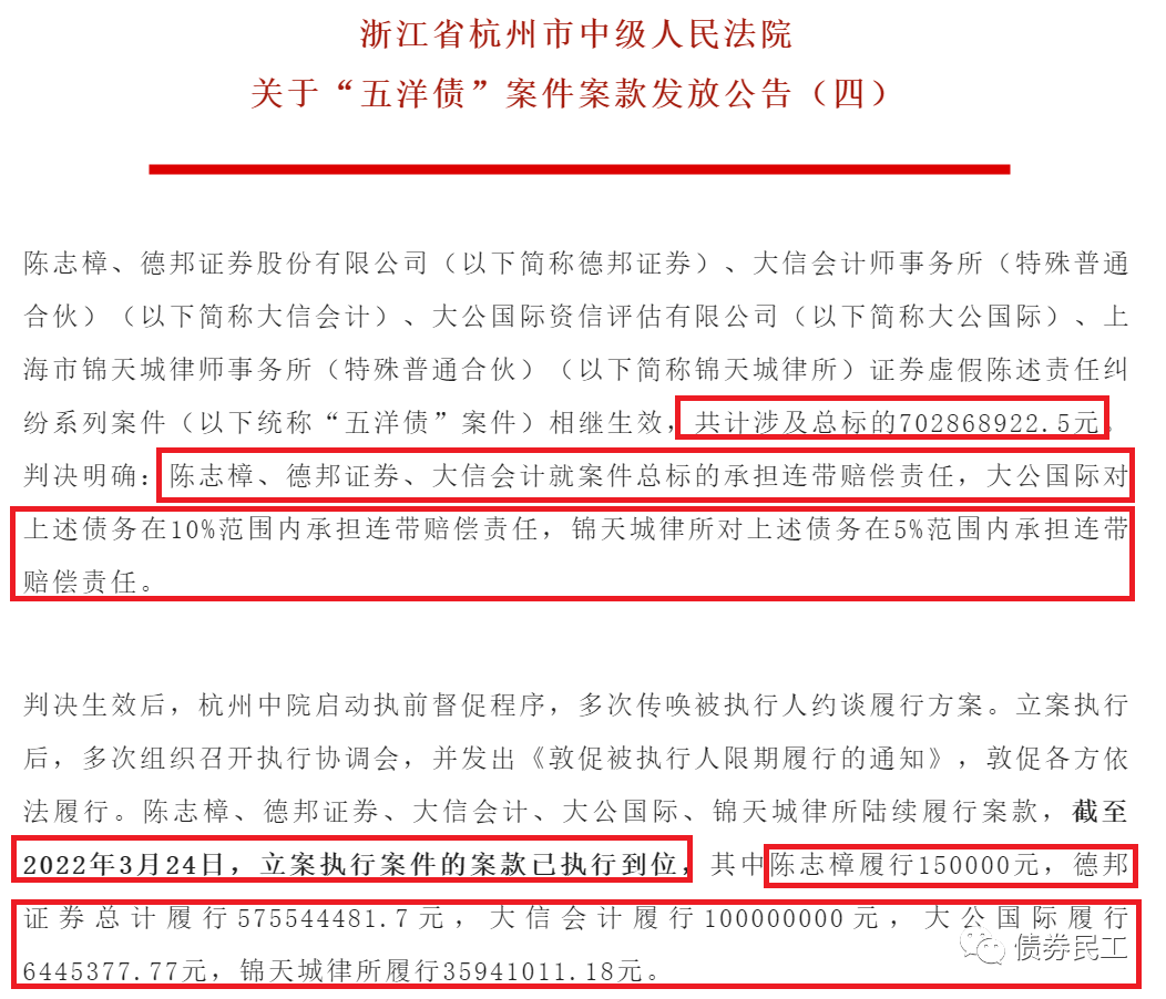 2021年1月,“五洋債”的一審判決認(rèn)定,證券公司、會(huì)計(jì)師師事務(wù)所、律師事務(wù)所等債券均被判決承擔(dān)賠償責(zé)任,其中陳志樟、德邦證券、大信會(huì)計(jì)就案件總標(biāo)的6.96億元承擔(dān)連帶賠償責(zé)任,大公國(guó)際資對(duì)上述債務(wù)在10%范圍內(nèi)承擔(dān)連帶賠償責(zé)任,錦天城律所對(duì)上述債務(wù)在5%范圍內(nèi)承擔(dān)連帶賠償責(zé)任。