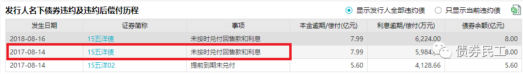 五洋建設(shè)于2016年12月被列入全國(guó)法院失信被執(zhí)行人名單。2017年8月14日,15五洋債在未按時(shí)兌付債券回售款和利息,成為引發(fā)五洋債債券欺詐發(fā)行的導(dǎo)火索。