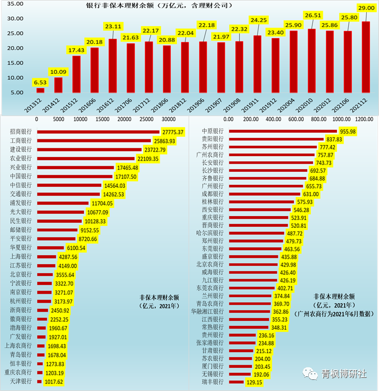 1、非保本理財余額超過1000億元的銀行有29家,這29家銀行的非保本理財余額合計達到25.66萬億,占全部銀行業理財的比例高達88%以上。