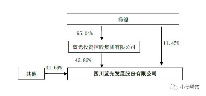 從股權結構上來看,藍光發展的控股股東為藍光控股,持股比例為46.86%,穿透后公司實控人為楊鏗。