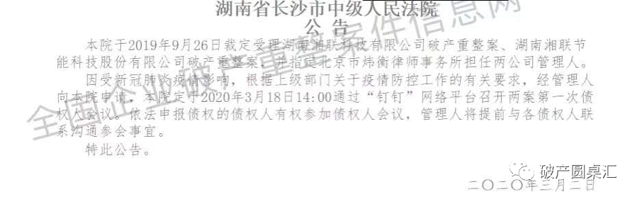 2019年11月,我們團隊被長沙市中級人民法院指定為湖南湘聯節能科技股份有限公司、湖南湘聯科技有限公司協同重整案的破產管理人。受新冠肺炎疫情影響,債權人復工時間不一或多居家避疫,為最大限度減少人員流動和聚集,同時推進拯救企業,長沙中院堅持疫情防控和拯救企業兩手抓、兩手硬,并于3月初決定以網絡形式合并召開兩案第一次債權人會議。筆者作為破產管理人團隊代表,全程與“釘釘”平臺對接,協調網絡債權人會議各項事務,幸運的是,此次債權人會議圓滿完成各項議程,達到預期效果。