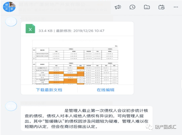 前期準備工作完成,管理人可將會議資料上傳至釘釘群文件,所有債權人均可下載查閱會議流程及會議內容。