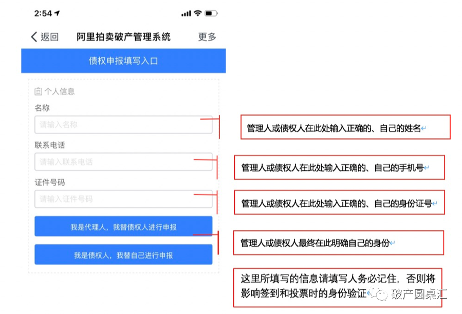 無論代理多少個債權人并填寫多少次被代理債權人的信息,代理人在此處所填寫、輸入的都應該是自己的身份信息,系統在收到這些信息后會自動將債權人信息與代理人“掛鉤”,方便代理人在債權會議中進行線上投票;