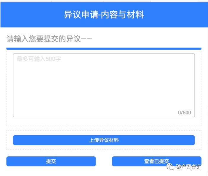 對債權表中記載的自己債權或他人債權有異議的,債權人可向管理人提出異議,債權人可點擊異議鏈接提交異議原因并上傳相關資料,當前異議鏈接僅支持輸入異議原因并上傳相關資料,不能前置選擇是否存在異議,建議未來可對此加以完善,對異議鏈接可以設置前置選擇程序,對自己債權是否存在異議,如果存在則說明原因并上傳相關資料,對他人債權是否存在異議同理。