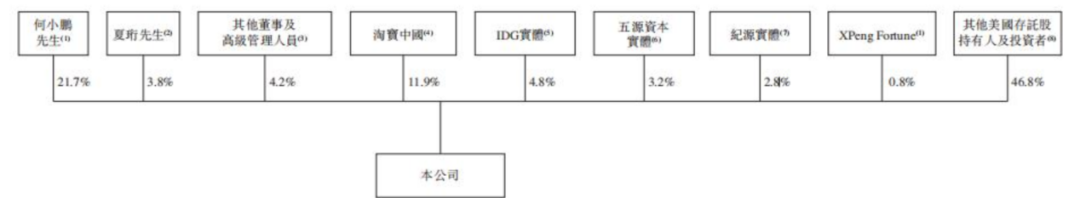 招股書顯示,小鵬汽車聯(lián)合創(chuàng)始人、董事長兼首席執(zhí)行官何小鵬及其關(guān)聯(lián)公司持股21.75%,為控股股東;淘寶中國持股11.9%,為最大機(jī)構(gòu)股東,IDG資本持股4.8%,小鵬汽車聯(lián)合創(chuàng)始人、總裁夏珩及其關(guān)聯(lián)公司持股3.8%,五源資本持股3.2%,紀(jì)源資本持股2.8%。