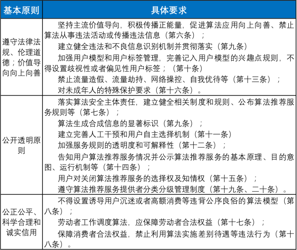 對于算法合規(guī)的原則和方法,國家網(wǎng)信辦于今年8月27日發(fā)布了《互聯(lián)網(wǎng)信息服務(wù)算法推薦管理規(guī)定(征求意見稿)》,對應(yīng)用算法推薦技術(shù)[5]提供互聯(lián)網(wǎng)信息服務(wù)的基本原則、基本管理制度作了較為全面而系統(tǒng)的規(guī)定。這也可以作為企業(yè)建立算法合規(guī)的一個重要參考,現(xiàn)將其主要內(nèi)容整理如下: