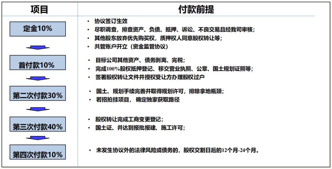 在收并購項目中,一般會將對價分多批次支付,通過共管+解付條件控制每一筆資金支出。所謂不見兔子不撒鷹,每一筆款項支付必須結合關鍵節點+得到對等的權益。如涉及到需要我方先付的情況,則必須要求對方足額擔保。