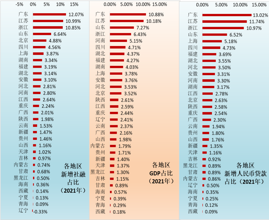 (一)五個(gè)地區(qū)合計(jì)獲得了全國(guó)44%以上的社融和47%以上的貸款支持