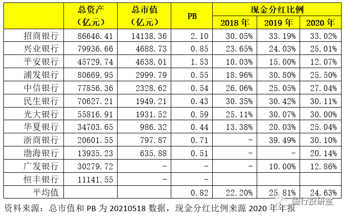 2、2018-2020年股份行的現(xiàn)金分紅比例平均分別為22.20%、25.18%和24.63%。不過分紅比例與其市值之間并沒有對應(yīng)關(guān)系,如分紅比例最高的招行其市值亦比較高,而市值較高的平安銀行其分紅比例卻僅有12.07%。