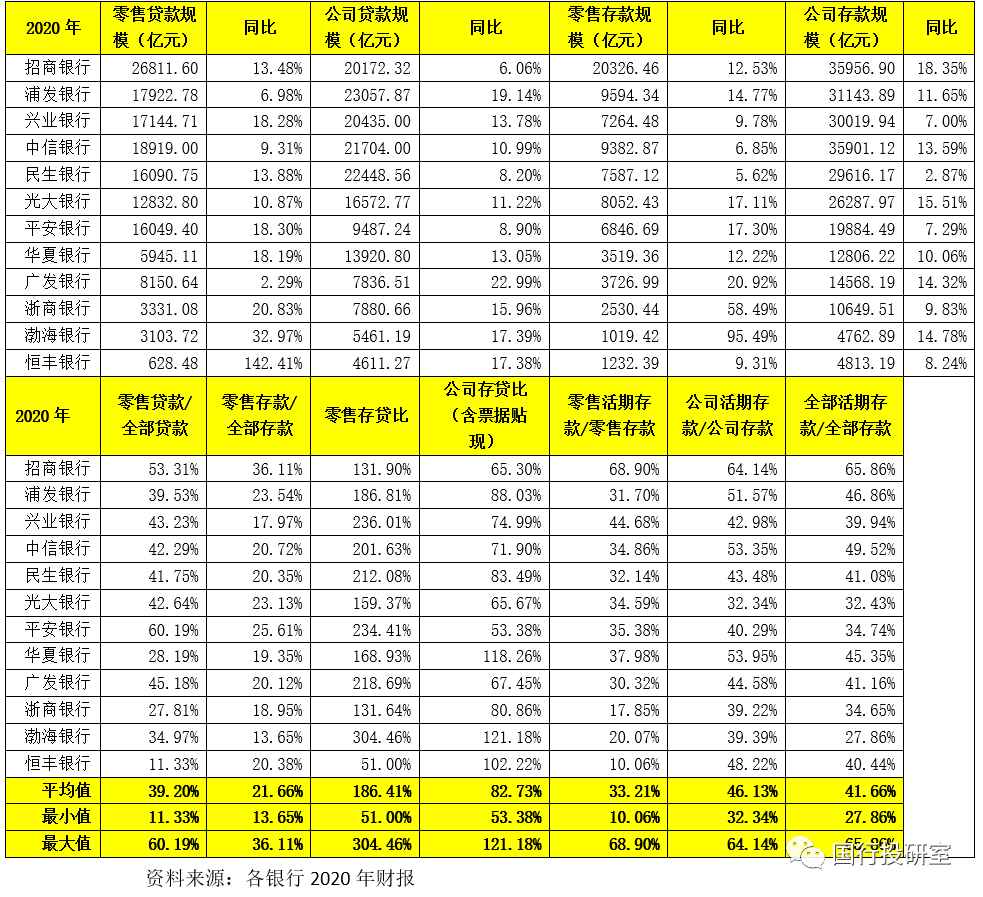 (1)截至2020年底,12股份行的零售存款和貸款余額分別為8.11萬億和14.69萬億,公司存款和貸款余額分別為25.64萬億和17.36萬億,票據(jù)貼現(xiàn)合計為2.25萬億。顯然,零售存貸比和公司存貸比(含票據(jù)貼現(xiàn))的平均值分別為186.41%和82.73%,可以看出公司存款在股份行中多起到全行流動性的職能,重要性可見一斑。