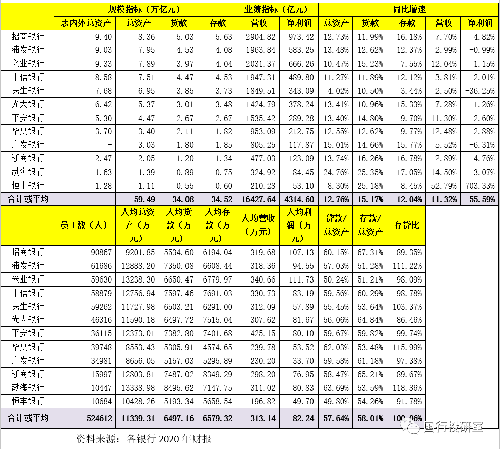 12家股份行共擁有52.46萬名員工,總資產(chǎn)、貸款與存款合計分別為59.49萬億、34.08萬億、34.52萬億,合計實現(xiàn)16248億元營收和4315億元凈利潤。