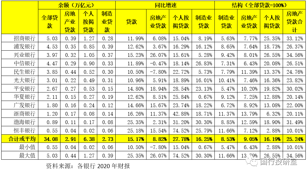 (1)截至2020年底,12家股份行的制造業(yè)貸款余額達(dá)到2.73萬億、個人住房貸款余額為6.38萬億(全部房地產(chǎn)貸款余額為9.29萬億)。